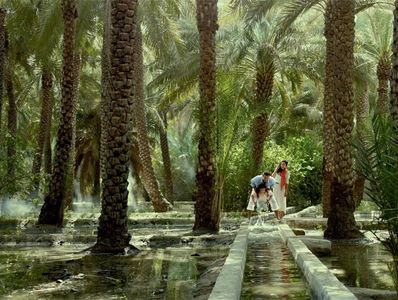 El oasis refleja 8000 años de historia — cubre 3000 acres y es el hogar de 147,000 palmeras de dátiles de 100 especies diferentes. Los visitantes se dan una idea de los edificios del oasis, el Sistema Falaj y los métodos tradicionales de cultivo de palmeras. Esta reserva arqueológica está compuesta por el jardín pre-oasis, el huerto y el jardín simbólico.
